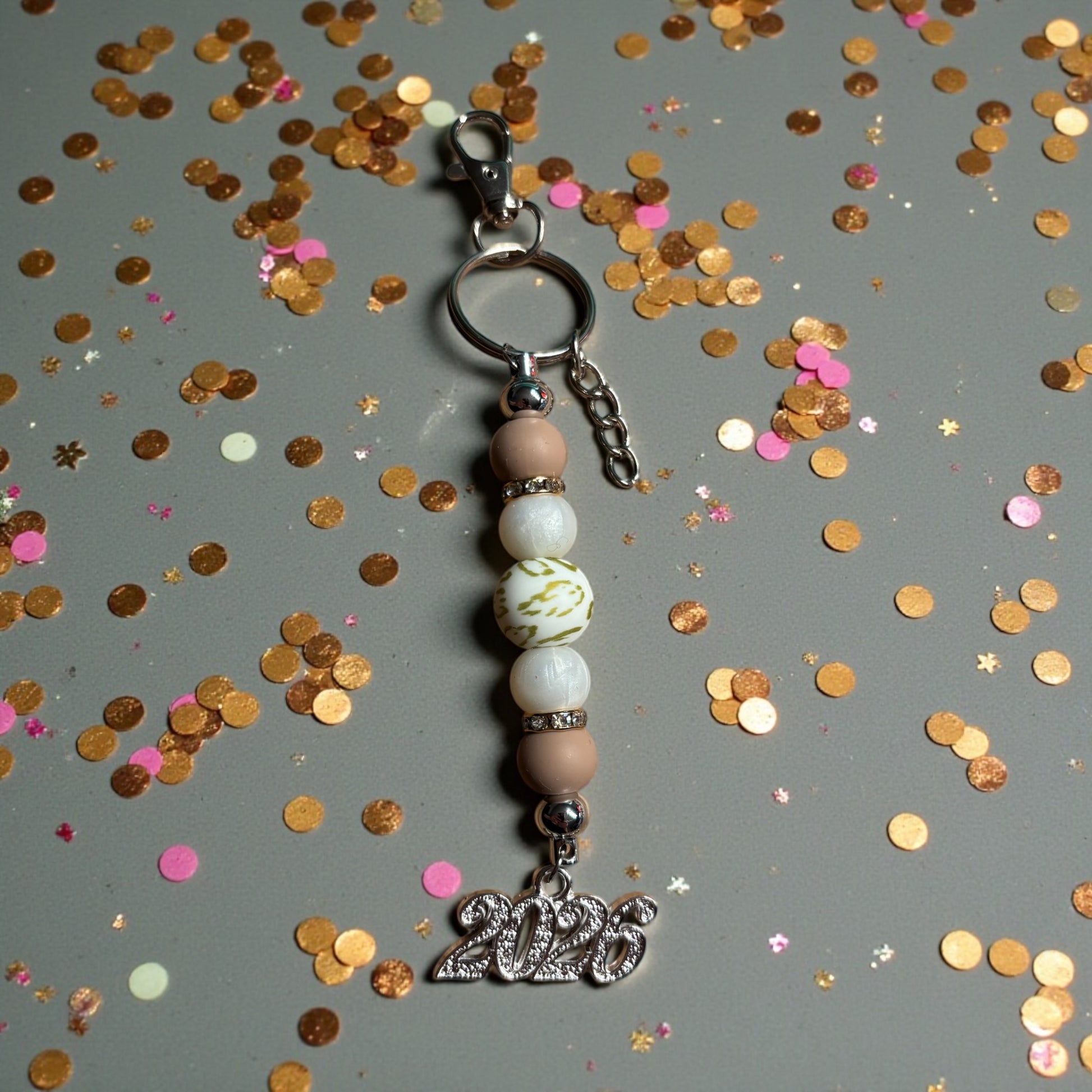 Step into the new year with intention and style with the 2026 Moment Keychain. This handmade beaded keychain features a calming neutral color palette with earthy brown beads, frosted white accents, and a unique green-pattern statement bead, finished with sparkling silver-tone rhinestone spacers and a shimmering 2026 charm.
