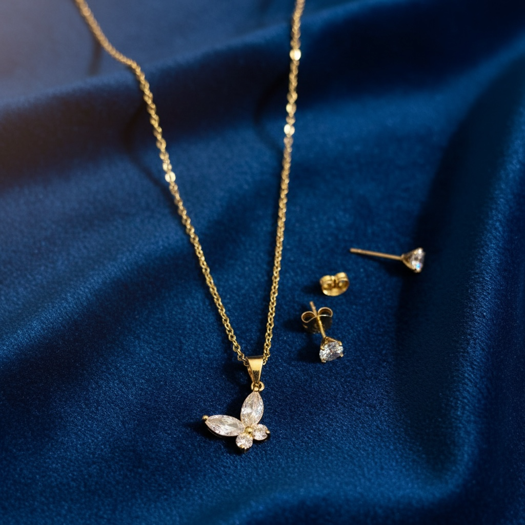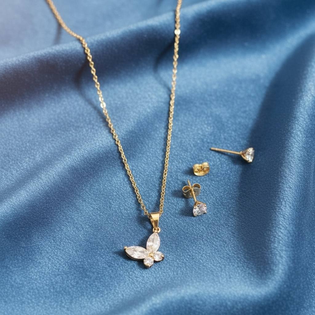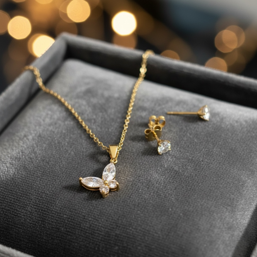 The Eliana Flutter Set features a delicate gold-tone cubic zirconia butterfly necklace paired with matching cubic zirconia stud earrings. Designed to shimmer with every movement, this elegant set adds a touch of femininity to both everyday looks and special moments.