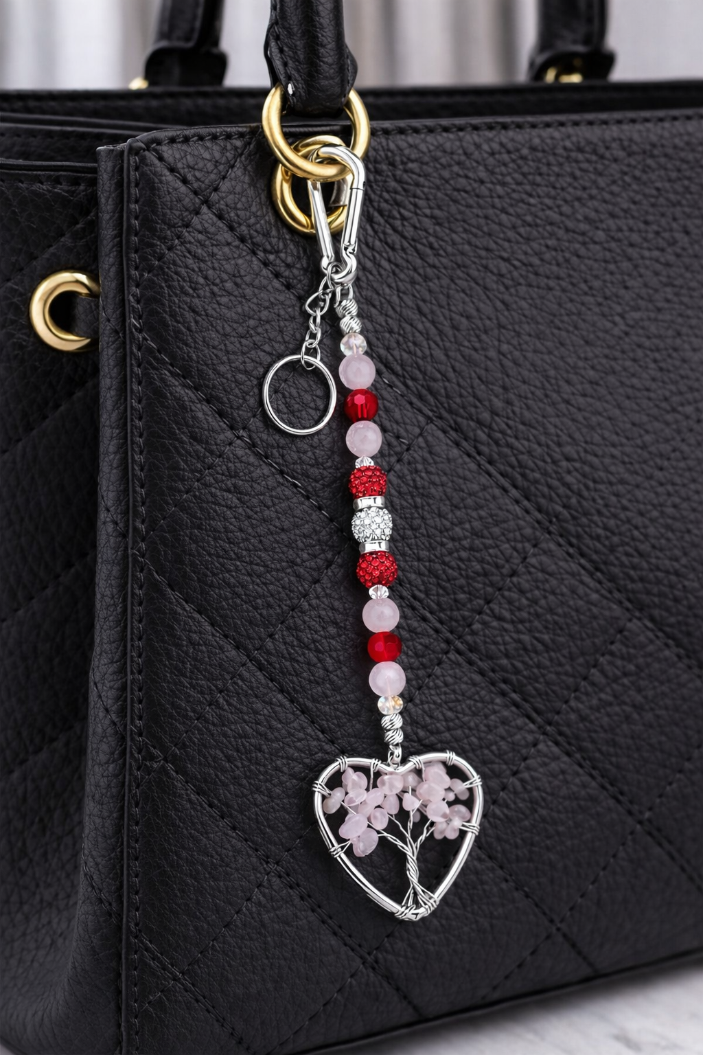 At the center is a silver-tone Tree of Life charm adorned with genuine rose quartz chips, symbolizing love, emotional balance, and personal growth. Finished with a secure clasp, it easily attaches to purses, totes, backpacks, or key rings—making it a versatile and meaningful accessory.