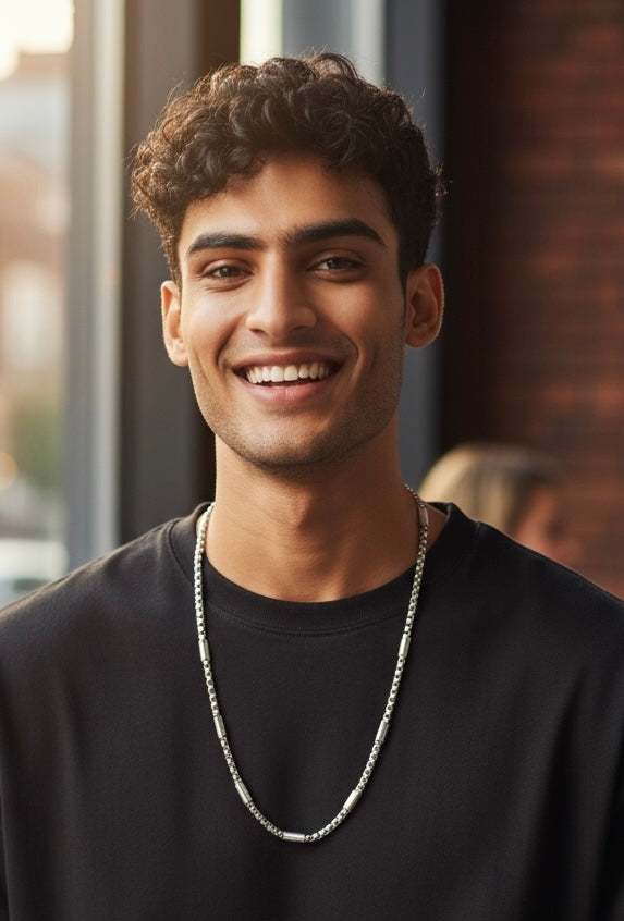 Elevate your everyday style with this stainless steel box link necklace, designed for both men and women who appreciate sleek, modern jewelry. Crafted with high-quality stainless steel, this necklace features a unique box chain design accented with polished cylindrical segments, giving it a bold yet refined look.