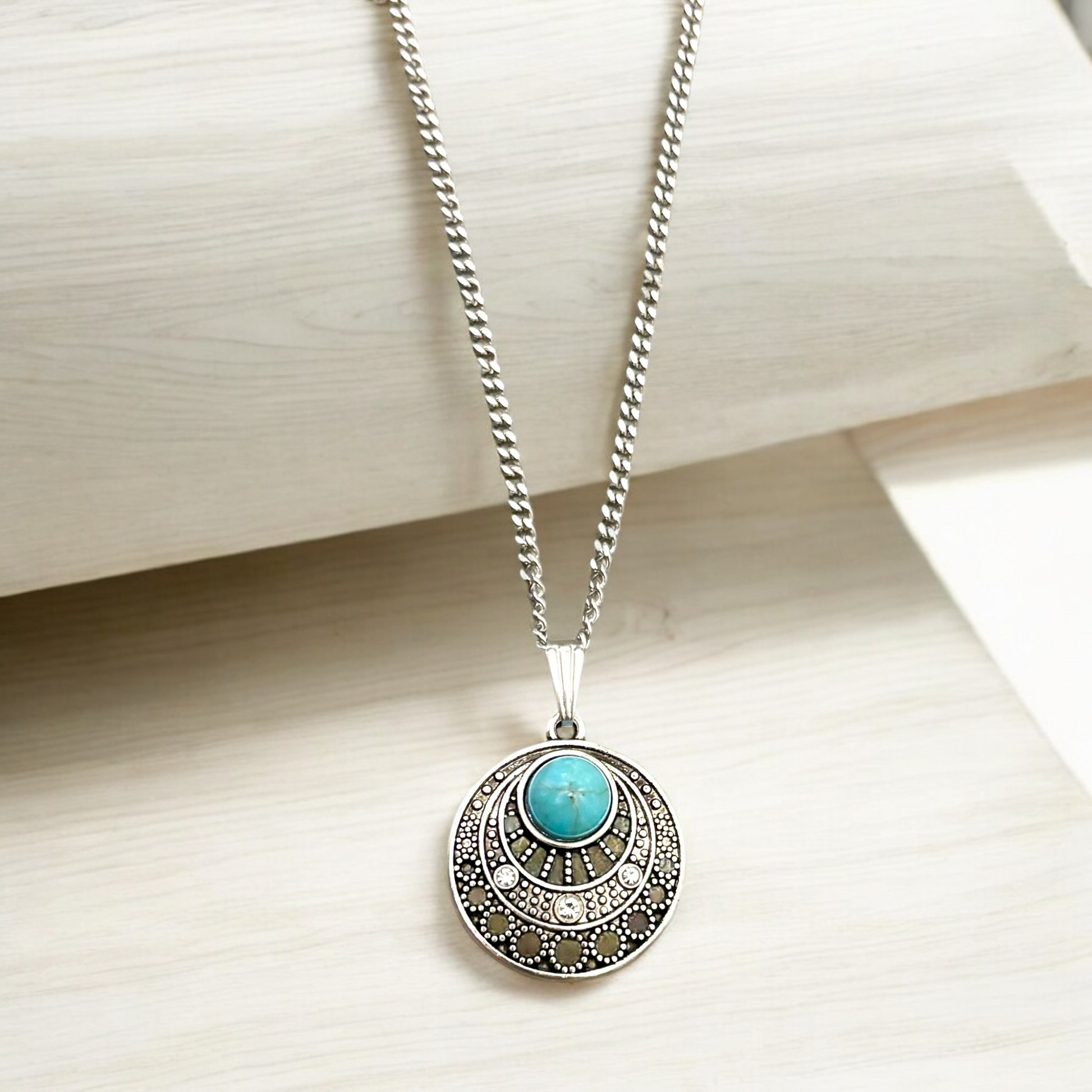 This exquisite Boho necklace features a stunning turquoise stone pendant elegantly suspended from a sleek silver chain. The imitation turquoise stone offers a vibrant pop of color, making it a perfect accessory for both casual and formal attire. Its unique design embodies a free-spirited aesthetic, ideal for those who appreciate a blend of natural beauty and contemporary style.