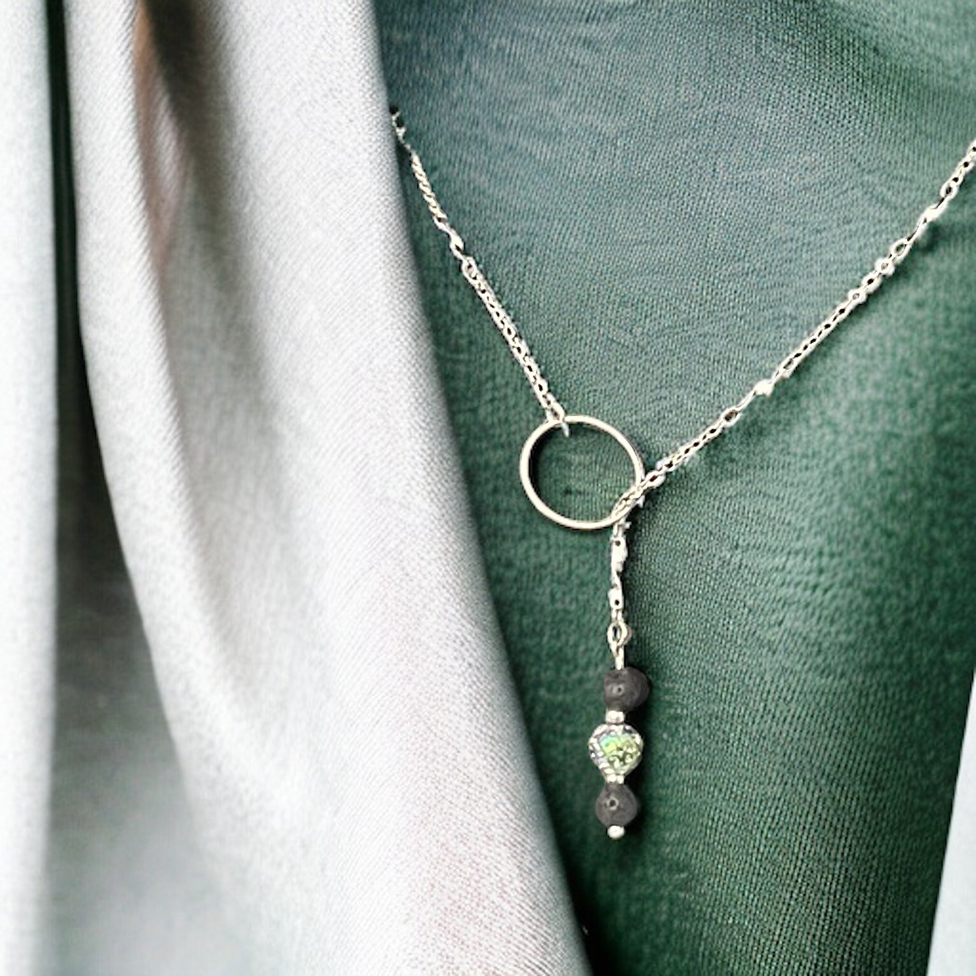 Elegant stainless steel Necklace with 2 Lava rocks and 1 Rainbow Lava Rock is an addition to our Spritz of Wellness Collection. Rock size 6 & 8mm, available in variety of lengths