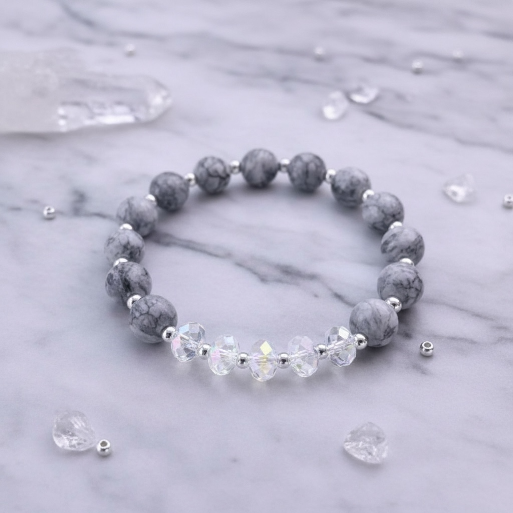 The soft grey tones and organic patterns of Map Jasper offer grounding energy and emotional stability, while the iridescent AB crystals catch the light beautifully—symbolizing clarity, harmony, and inner peace. Finished with polished silver-tone spacers, this bracelet blends natural elegance with subtle sparkle.