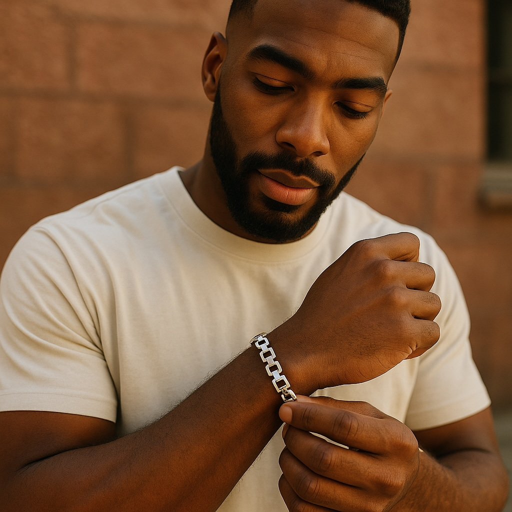 This silver bracelet breaks the mold with bold, stylish square links that command attention. Its edgy design fuses modern flair with unapologetic confidence, making it the perfect statement piece to elevate your look and showcase your fearless style.