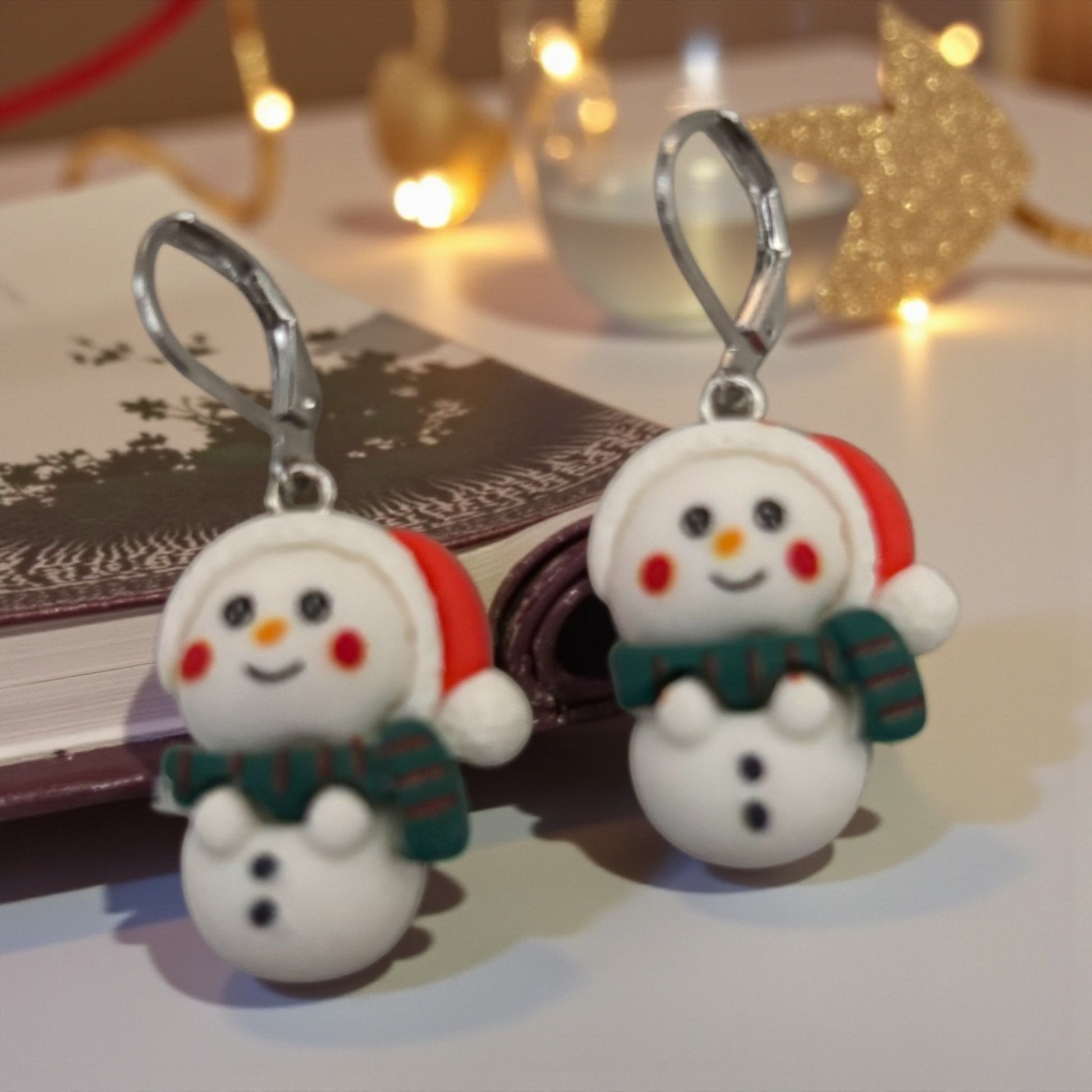 Add festive charm to your holiday look with these adorable handmade resin snowman earrings! Each pair features a smiling snowman wearing a Santa hat and cozy scarf. Lightweight, durable, and available in your choice of hook or hoop style for the perfect fit. Made in Canada