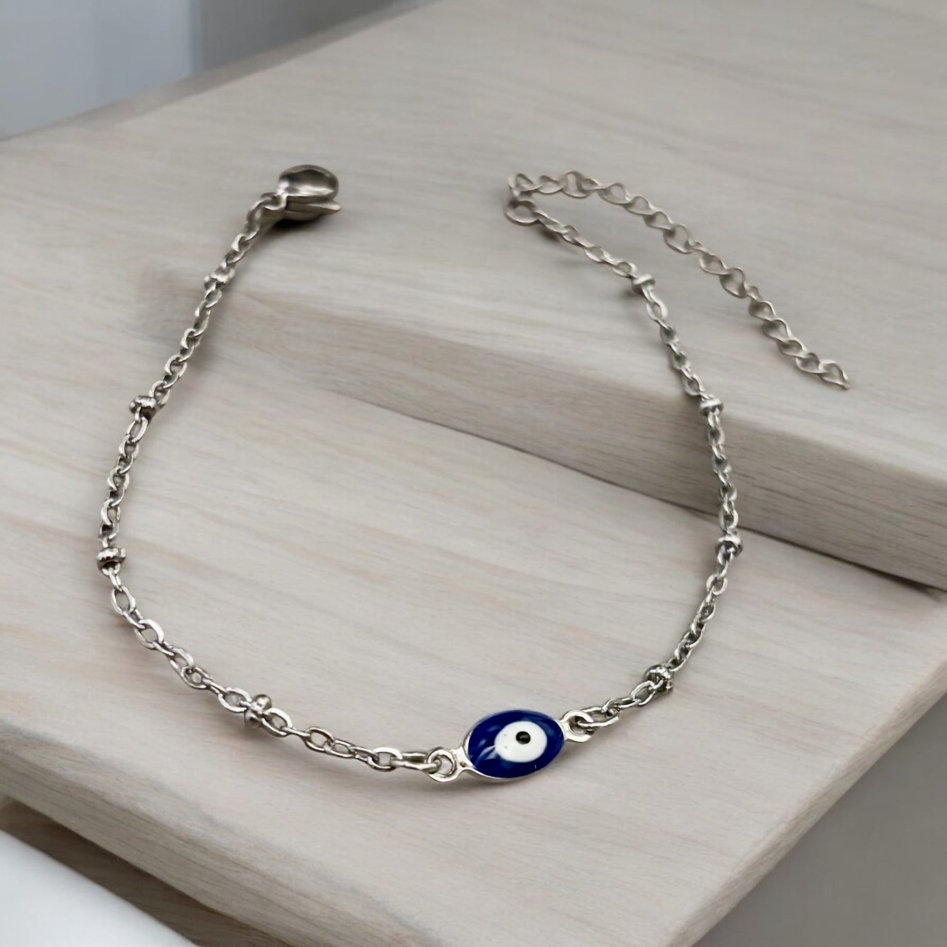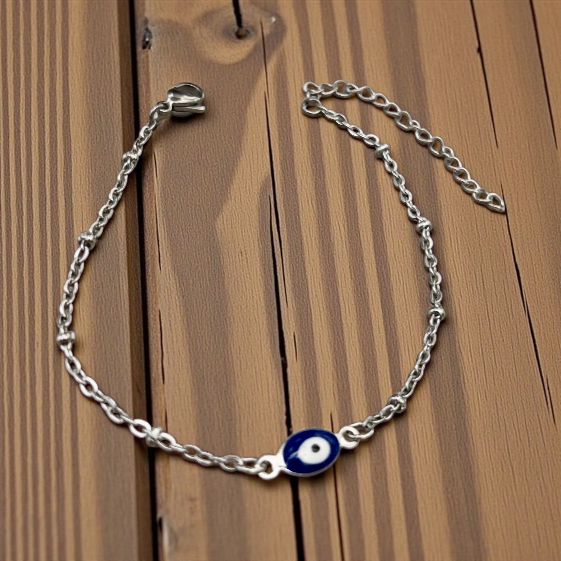 Adorn your wrist with this stunning blue evil eye bracelet, crafted from durable stainless steel. The vibrant blue charm glimmers against a sleek chain, offering both protection and style. Perfect for everyday wear or special occasions, this bracelet combines elegance with a touch of mystique, making it a must-have accessory for anyone seeking to ward off negativity while looking fabulous