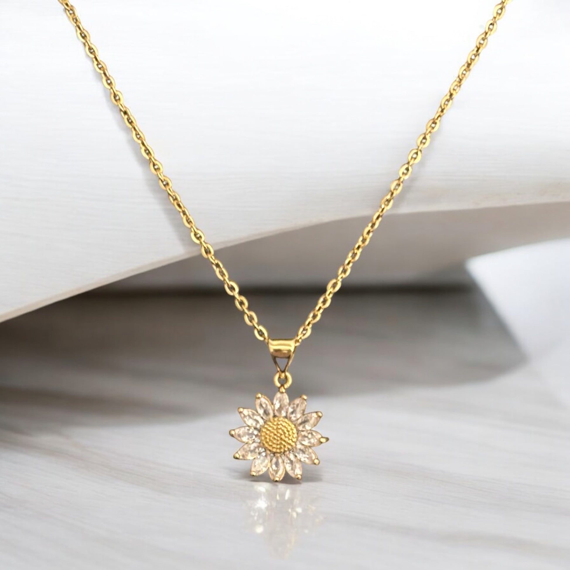 This exquisite gold necklace featuring a delicate daisy pendant made with sparkling Zirconia This stunning piece combines timeless elegance with a touch of nature-inspired charm, making it perfect for both everyday wear and special occasions. Design from high-quality gold plated stainless steel the necklace is designed to withstand the test of time while adding a radiant glow to any outfit. Embrace the beauty of simplicity and let this daisy pendant symbolize purity and new beginnings in your life