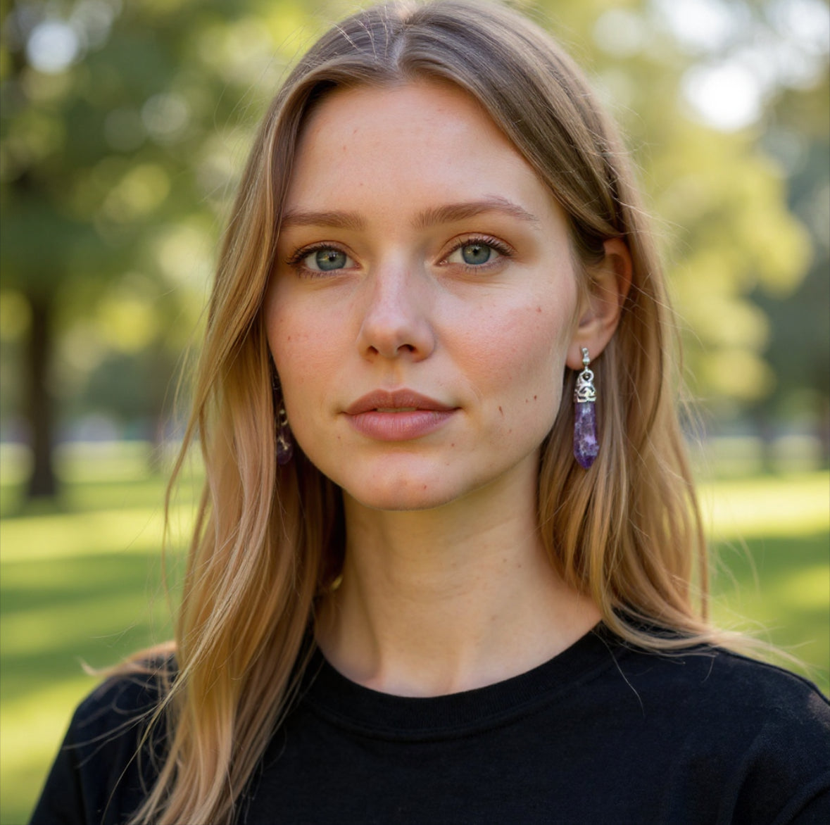 Violet’s Earrings feature elegantly crafted amethyst pendants in a distinctive hexagonal pointed bullet shape. Their refined design highlights the gemstone’s rich purple hues, adding a touch of sophistication. Perfect for those who appreciate unique and timeless jewelry.